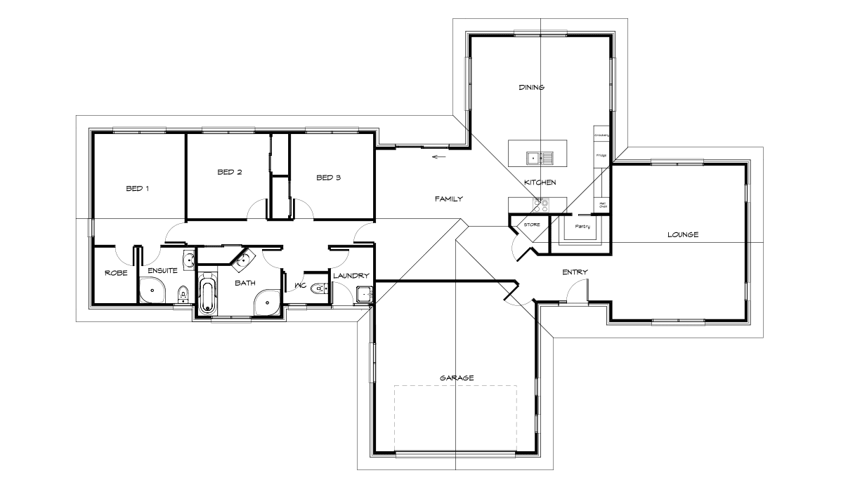 Very simple, practical layout. The centred main bathroom gives great flow to bedrooms plus a separate lounge down the opposite end of the house for when you’re entertaining.